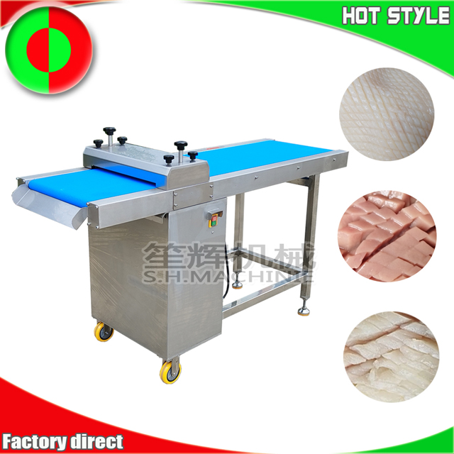 La version étendue du coupe-calamars à grande vitesse convient à la découpe de calamars, de poulpes, de gésiers de poulet, de gésiers de canard, de rognons de porc, de testicules d'agneau, d'ormeaux et d'autres matières. Un motif en maille peut être découpé en un seul passage, sans avoir besoin de retourner l'aliment et de le repasser dans la machine.